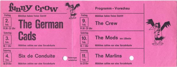 Bobby Gibson & The Bondsmen: 1.6. bis 24.6.64 (später wurde dies auf der Bühnenwand überpinselt, und vorher hatte es Bobby Gibson & The Bobcats 1.6. bis 14.6.64 geheißen)